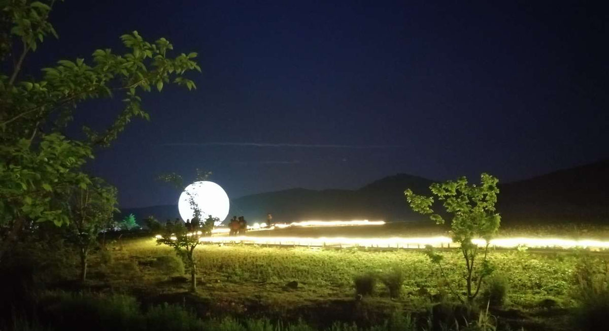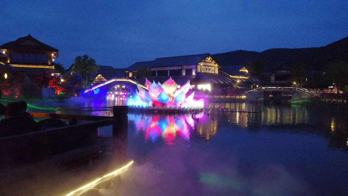 拈花灣景點還有很多,拈花塔、妙音臺、梵天花海、福田閣、禪樂館還有獨特的拈花客棧等,每一處都讓人留戀不舍,這里就不一一敘述了。身邊的美景讓人陶醉忘卻了時間,轉(zhuǎn)眼間已到傍晚,夕陽照射在古鎮(zhèn)上,仿佛為他披上金燦的紗衣是那么的美麗,金光普照的晚霞已經(jīng)落幕,古鎮(zhèn)的人漸漸增多。原來古鎮(zhèn)的夜景才是主題,隨著夜幕降臨,五彩炫麗的燈光秀拉開帷幕。湖中的水幕電影科技感十足,在花草綠水旁觀賞電影,實屬人生的第一次,感受非凡。走在小樹林中,在五彩燈光的照影下,加上人工噴霧制造出雨霧繚繞的氛圍,仿佛來到仙境般的美妙讓人陶醉。踏著悠閑的步伐來到了蓮花噴泉,隨著音樂的旋律,水中的噴泉不斷的變換形態(tài),平鏡的湖面上就像有人在跳舞,炫麗的燈光、動感的音樂、舞動的旋律加上圍觀人員的吶喊聲、歡呼聲使整個現(xiàn)場沸騰起來,簡直就是一場音樂狂歡會。
