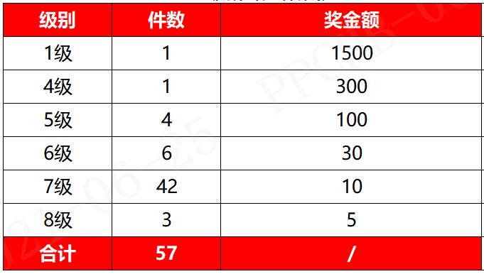 根據(jù)主管部門統(tǒng)計,現(xiàn)已收集到創(chuàng)新改善提案126件,其中57件在6月15日已通過評審,為了表示對員工參與改善工作的支持和鼓勵,公司對經(jīng)過評定的提案員工給予如下獎勵:
